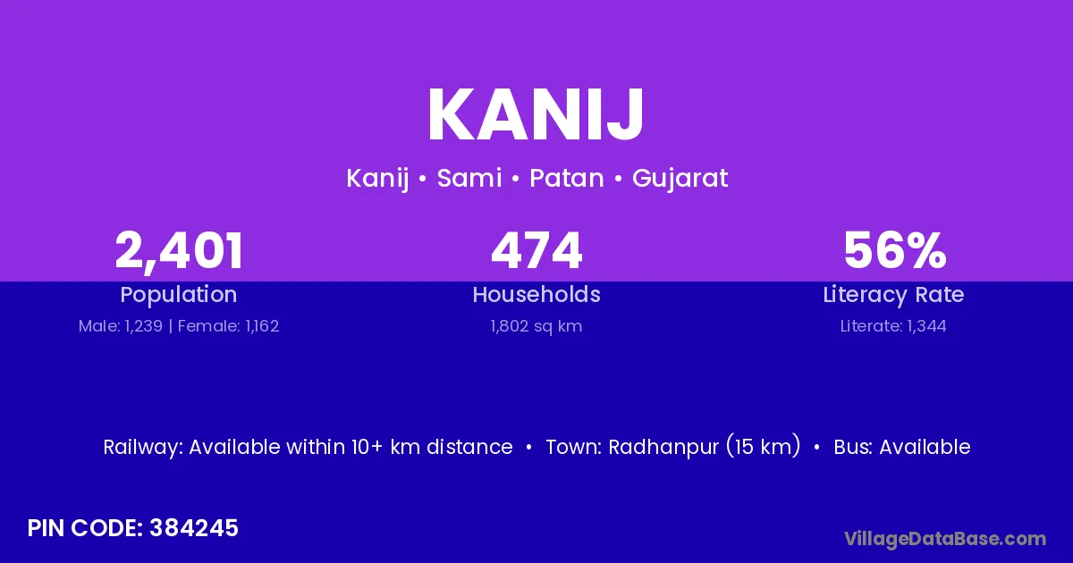 Radhanpur (15 km) is the nearest town to Kanij village for major economic activities and is located approximately 15 km away.