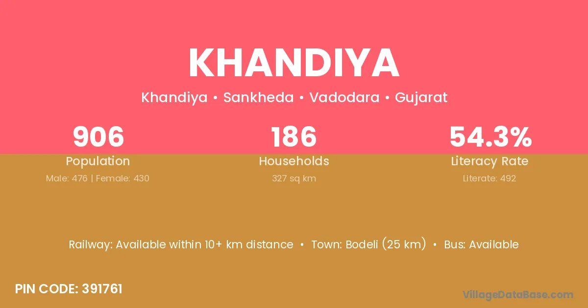 Harij (38 km) is the nearest town to Khandiya village for major economic activities and is located approximately 38 km away.