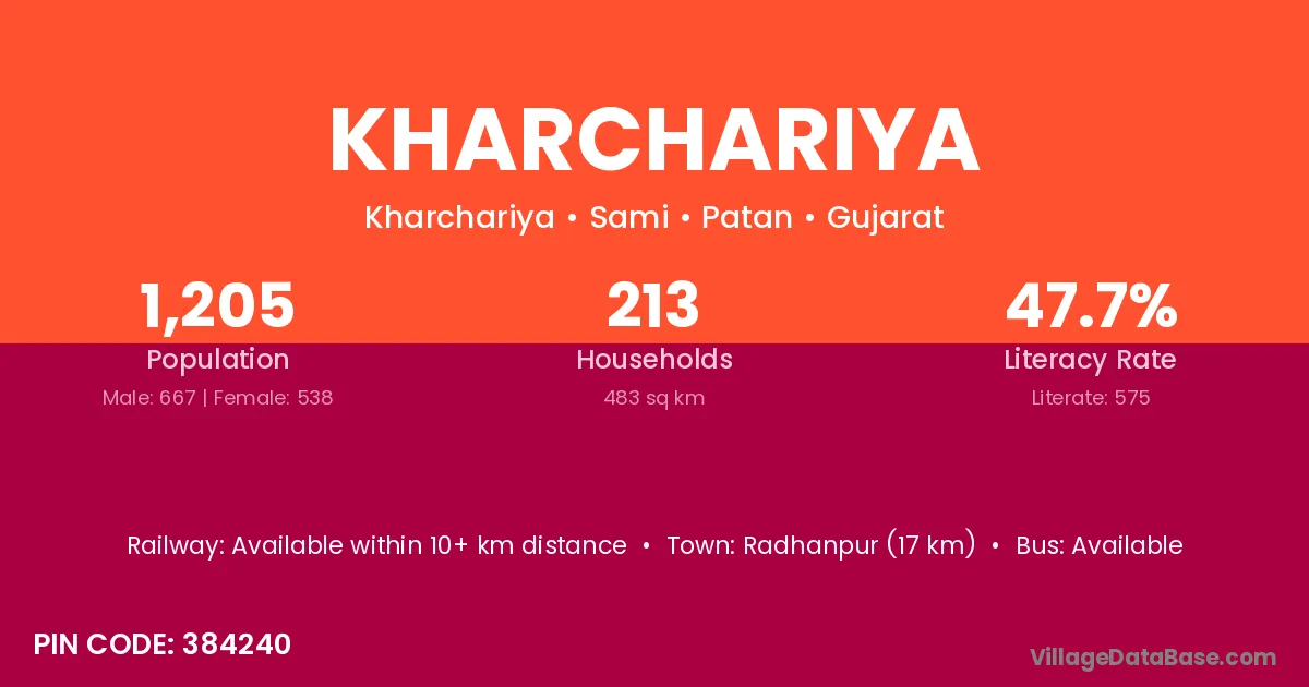 Radhanpur (17 km) is the nearest town to Kharchariya village for major economic activities and is located approximately 17 km away.
