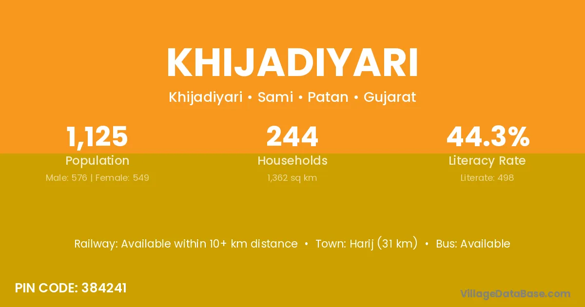 Harij (31 km) is the nearest town to Khijadiyari village for major economic activities and is located approximately 31 km away.