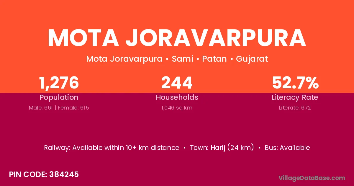 Harij (24 km) is the nearest town to Mota Joravarpura village for major economic activities and is located approximately 24 km away.