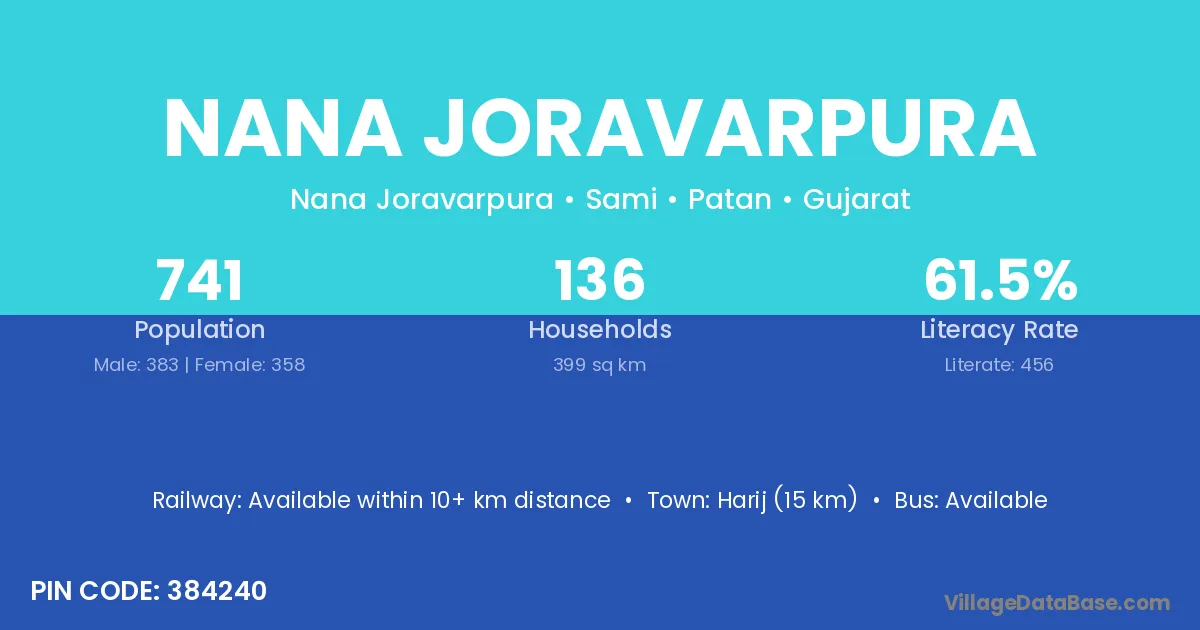 Harij (15 km) is the nearest town to Nana Joravarpura village for major economic activities and is located approximately 15 km away.