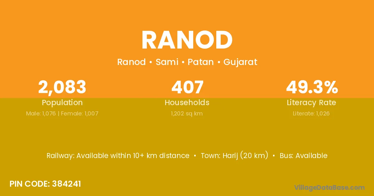 Harij (20 km) is the nearest town to Ranod village for major economic activities and is located approximately 20 km away.
