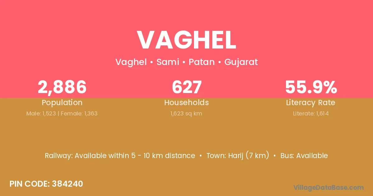 Harij (7 km) is the nearest town to Vaghel village for major economic activities and is located approximately 7 km away.