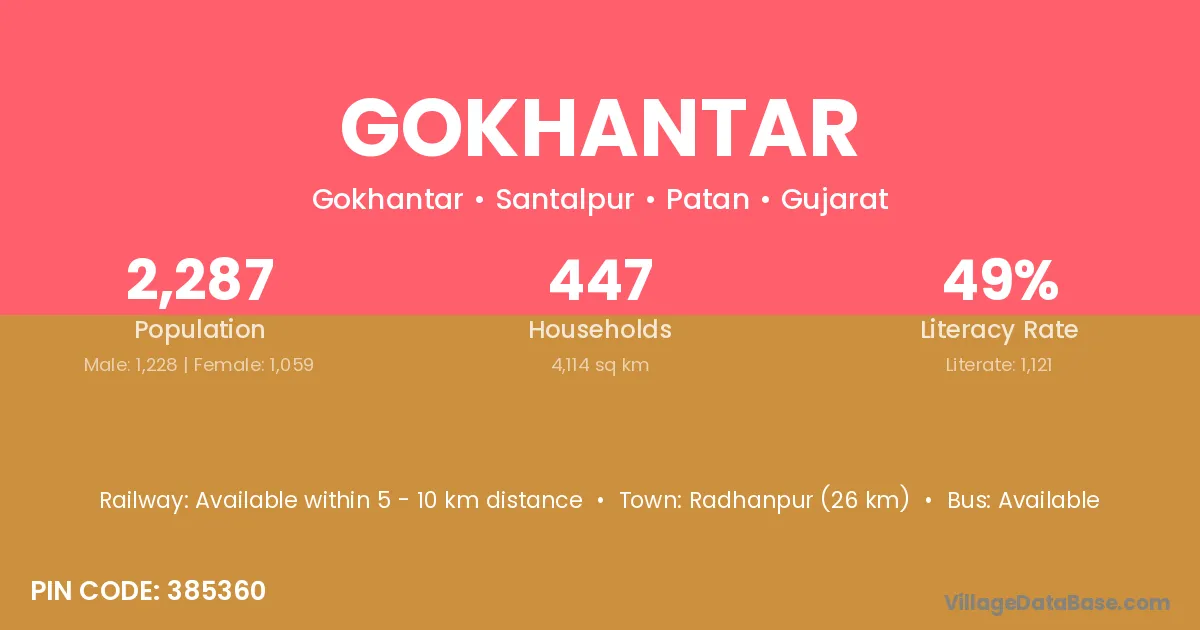 Radhanpur (26 km) is the nearest town to Gokhantar village for major economic activities and is located approximately 26 km away.