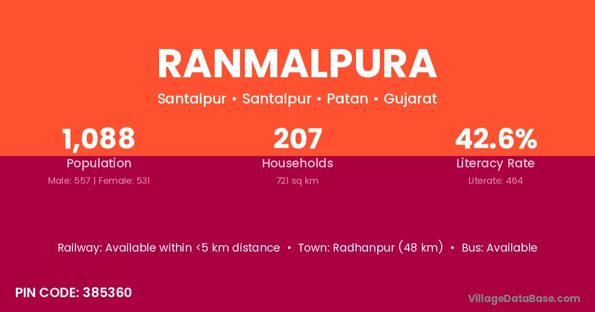 Radhanpur (48 km) is the nearest town to Ranmalpura village for major economic activities and is located approximately 48 km away.