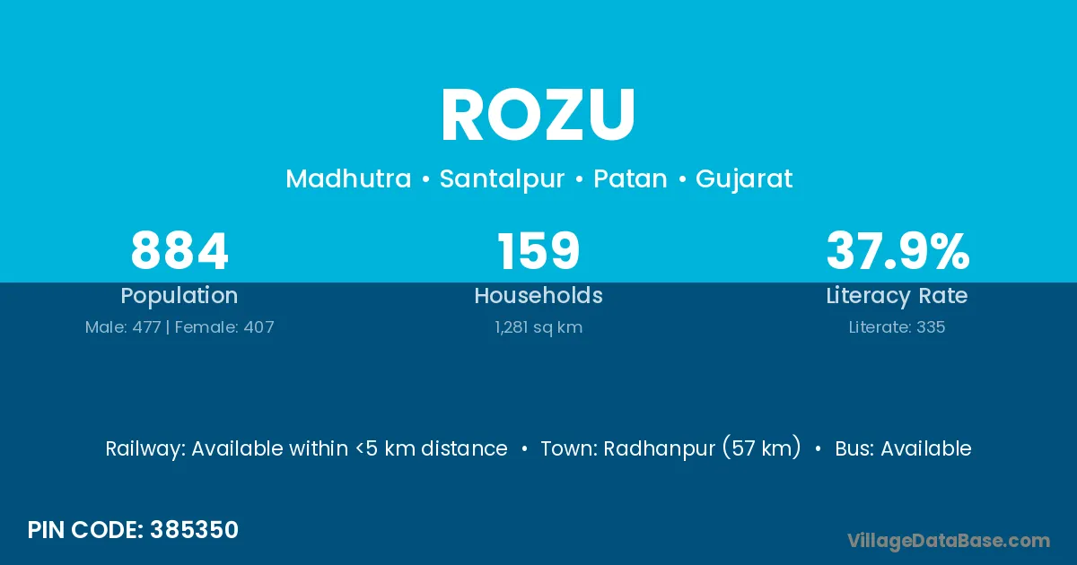 Radhanpur (57 km) is the nearest town to Rozu village for major economic activities and is located approximately 57 km away.