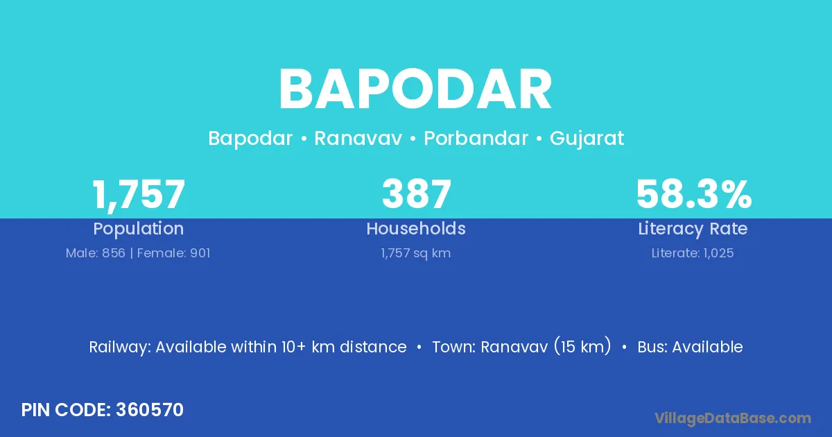 Ranavav (15 km) is the nearest town to Bapodar village for major economic activities and is located approximately 15 km away.