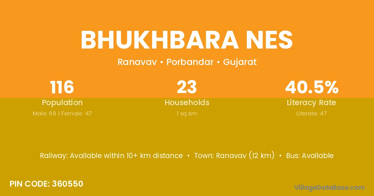 Ranavav (12 km) is the nearest town to Bhukhbara Nes village for major economic activities and is located approximately 12 km away.