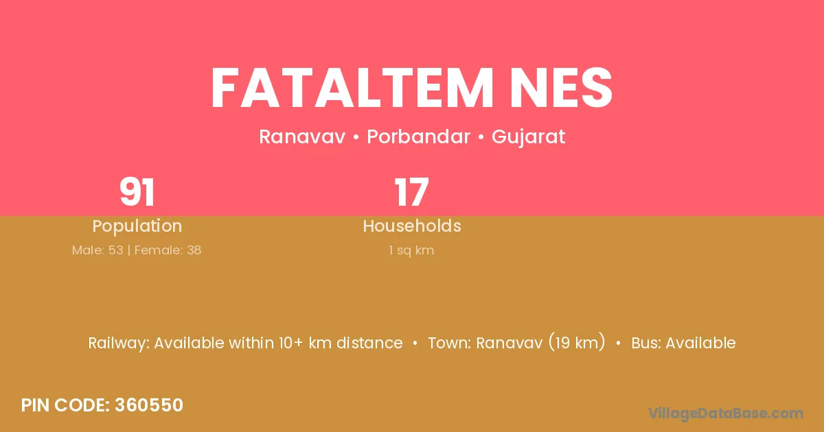 Ranavav (19 km) is the nearest town to Fataltem Nes village for major economic activities and is located approximately 19 km away.
