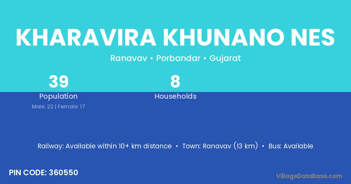 Ranavav (13 km) is the nearest town to Kharavira Khunano Nes village for major economic activities and is located approximately 13 km away.