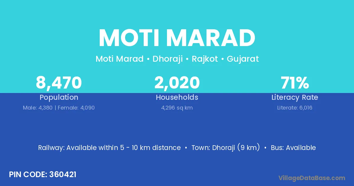 Dhoraji (9 km) is the nearest town to Moti Marad village for major economic activities and is located approximately 9 km away.