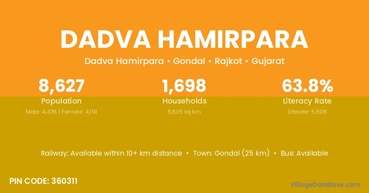 Gondal (25 km) is the nearest town to Dadva Hamirpara village for major economic activities and is located approximately 25 km away.