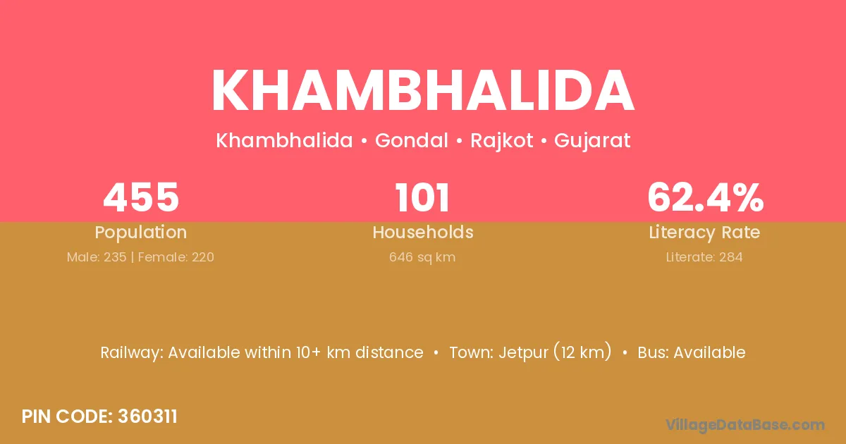 Jetpur (12 km) is the nearest town to Khambhalida village for major economic activities and is located approximately 12 km away.