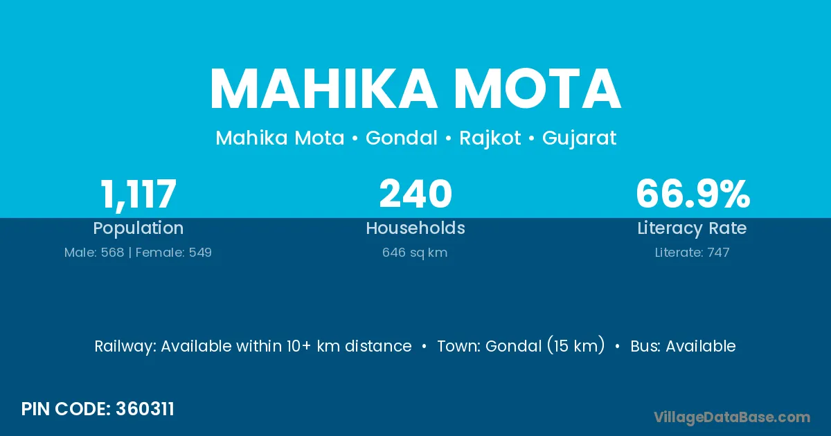 Gondal (15 km) is the nearest town to Mahika Mota village for major economic activities and is located approximately 15 km away.