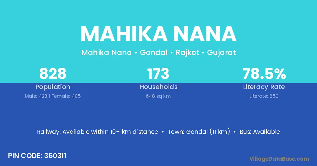 Gondal (11 km) is the nearest town to Mahika Nana village for major economic activities and is located approximately 11 km away.