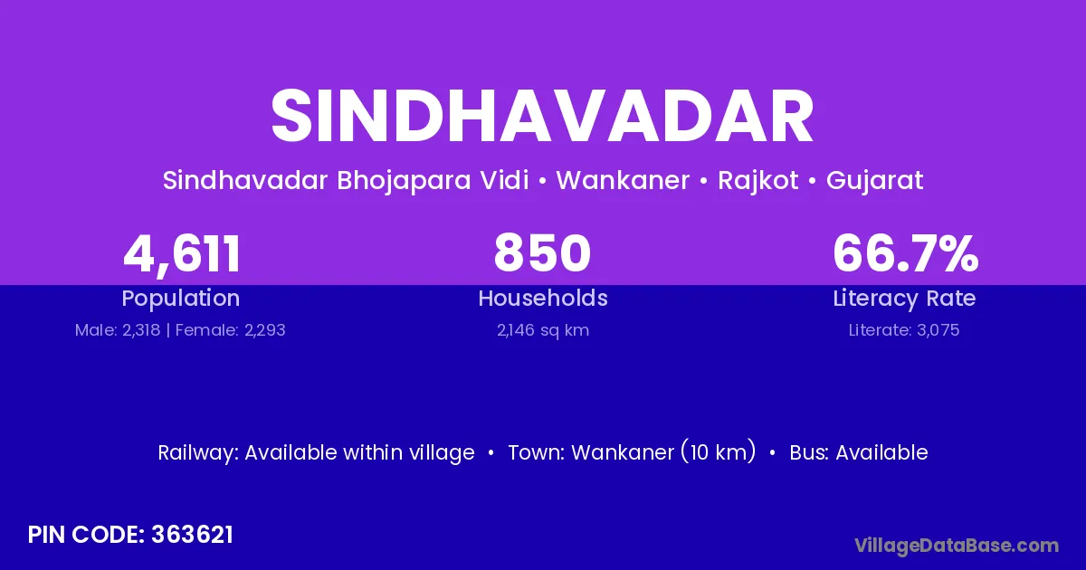 Gondal (16 km) is the nearest town to Sindhavadar village for major economic activities and is located approximately 16 km away.