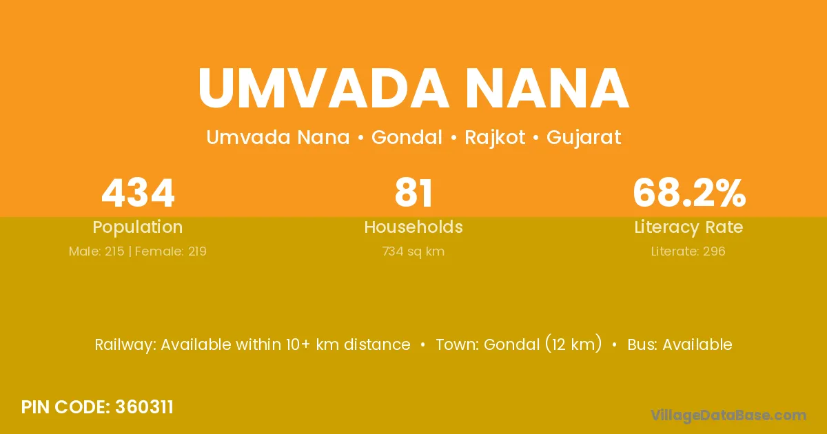 Gondal (12 km) is the nearest town to Umvada Nana village for major economic activities and is located approximately 12 km away.