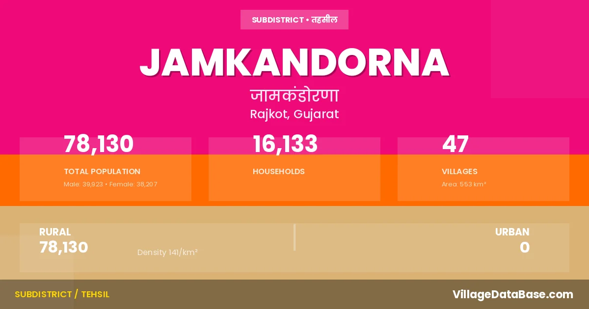 According to the 2011 census The total area of Jamkandorna Taluka is 553 km², with a population of 78130 people. The population density is 141 inhabitants per square kilometre, and there are approximately 16133 houses in the sub district.