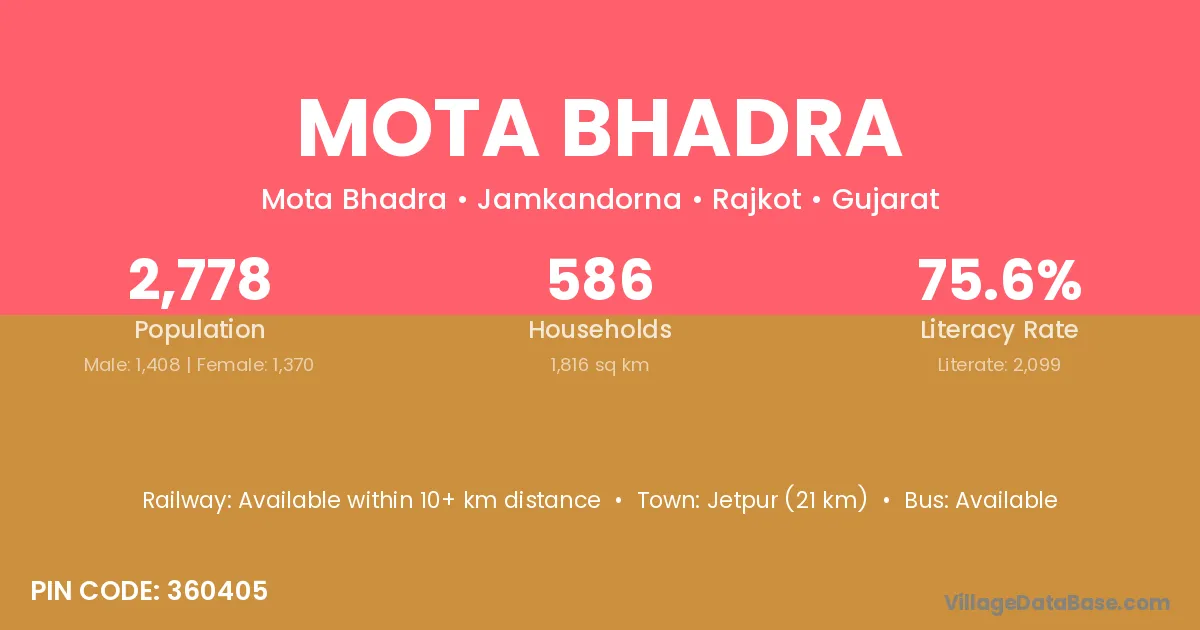 Jetpur (21 km) is the nearest town to Mota Bhadra village for major economic activities and is located approximately 21 km away.