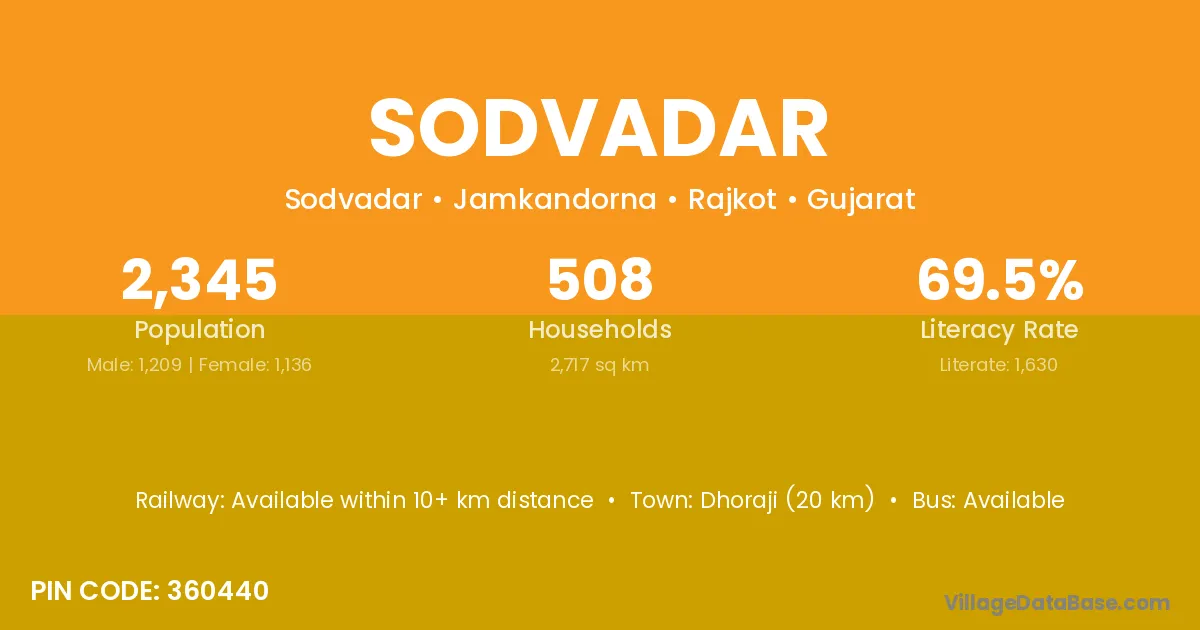 Dhoraji (20 km) is the nearest town to Sodvadar village for major economic activities and is located approximately 20 km away.