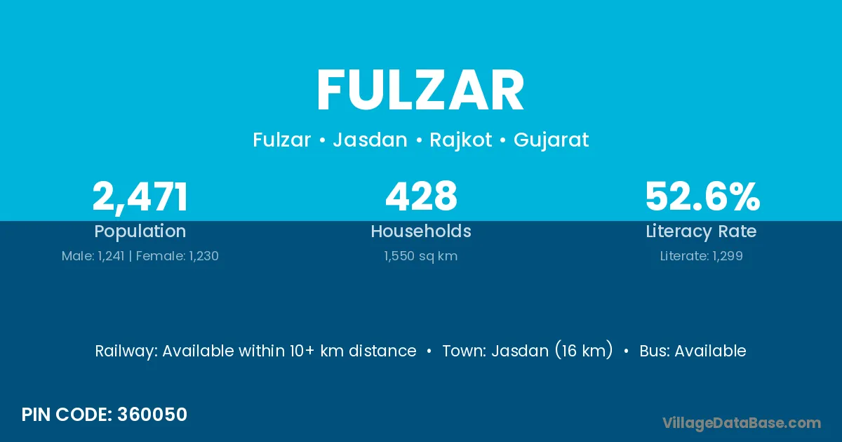Jasdan (16 km) is the nearest town to Fulzar village for major economic activities and is located approximately 16 km away.