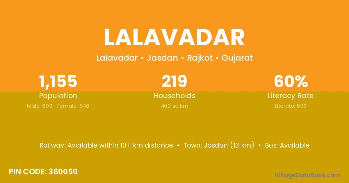 Jasdan (13 km) is the nearest town to Lalavadar village for major economic activities and is located approximately 13 km away.