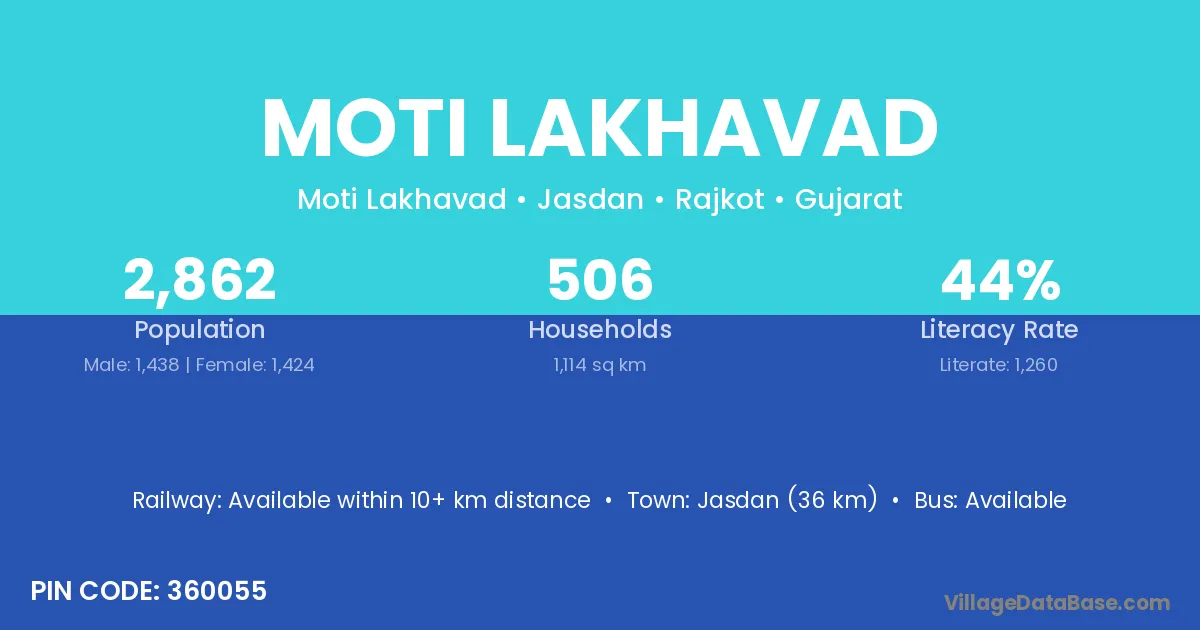 Jasdan (36 km) is the nearest town to Moti Lakhavad village for major economic activities and is located approximately 36 km away.