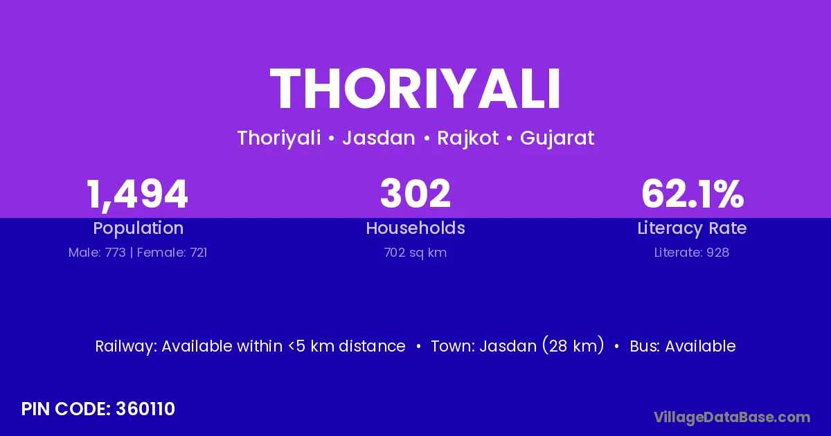 Jasdan (28 km) is the nearest town to Thoriyali village for major economic activities and is located approximately 28 km away.