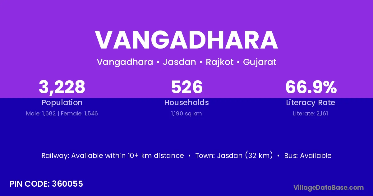 Jasdan (32 km) is the nearest town to Vangadhara village for major economic activities and is located approximately 32 km away.