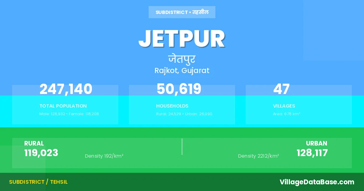 According to the 2011 census The total area of Jetpur Taluka is 678 km², with a population of 247140 people. The population density is 365 inhabitants per square kilometre, and there are approximately 50619 houses in the sub district.