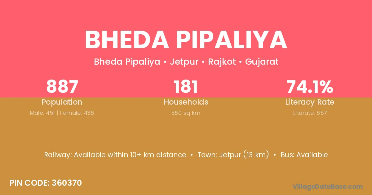 Jetpur (13 km) is the nearest town to Bheda Pipaliya village for major economic activities and is located approximately 13 km away.