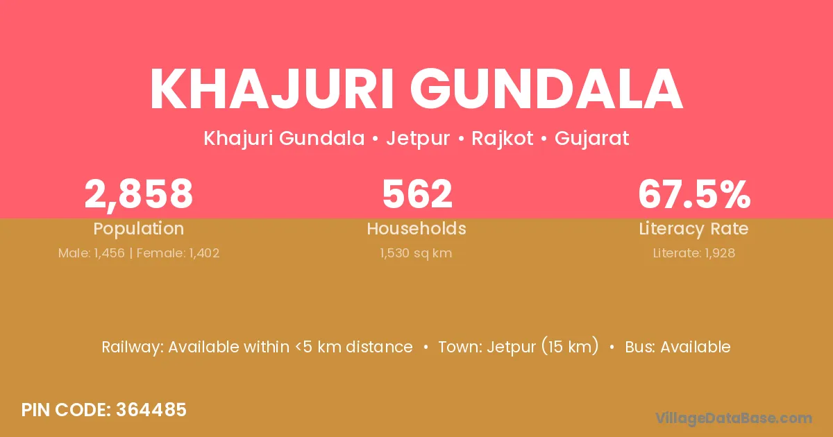 Jetpur (15 km) is the nearest town to Khajuri Gundala village for major economic activities and is located approximately 15 km away.