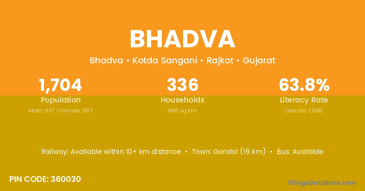 Gondal (19 km) is the nearest town to Bhadva village for major economic activities and is located approximately 19 km away.