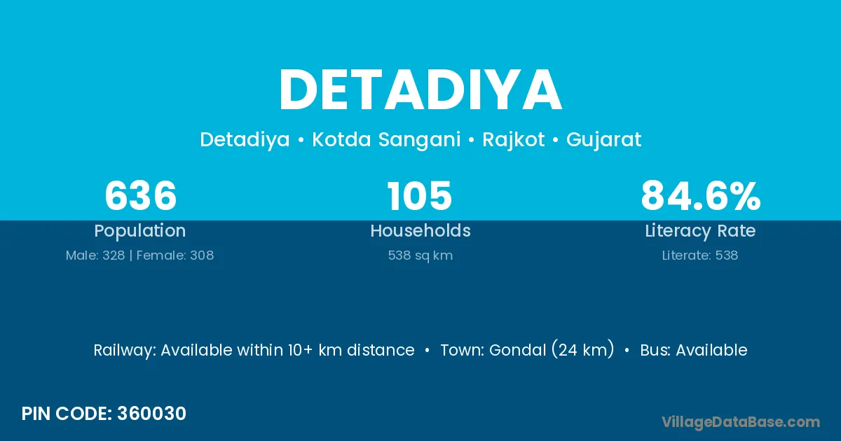 Gondal (24 km) is the nearest town to Detadiya village for major economic activities and is located approximately 24 km away.