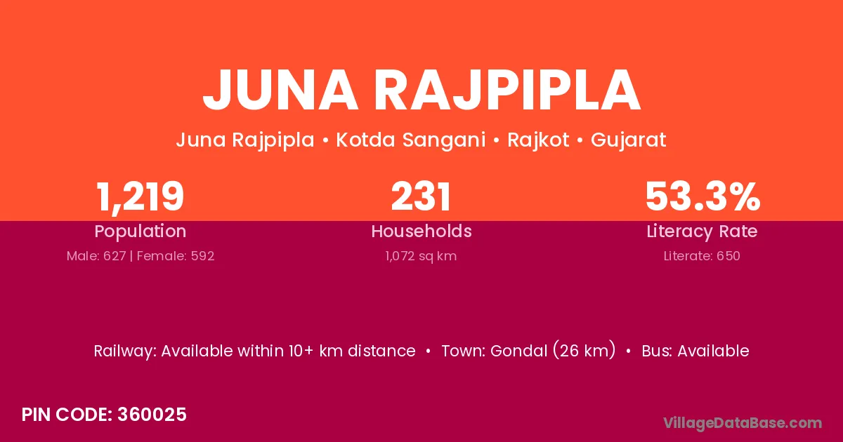 Gondal (26 km) is the nearest town to Juna Rajpipla village for major economic activities and is located approximately 26 km away.