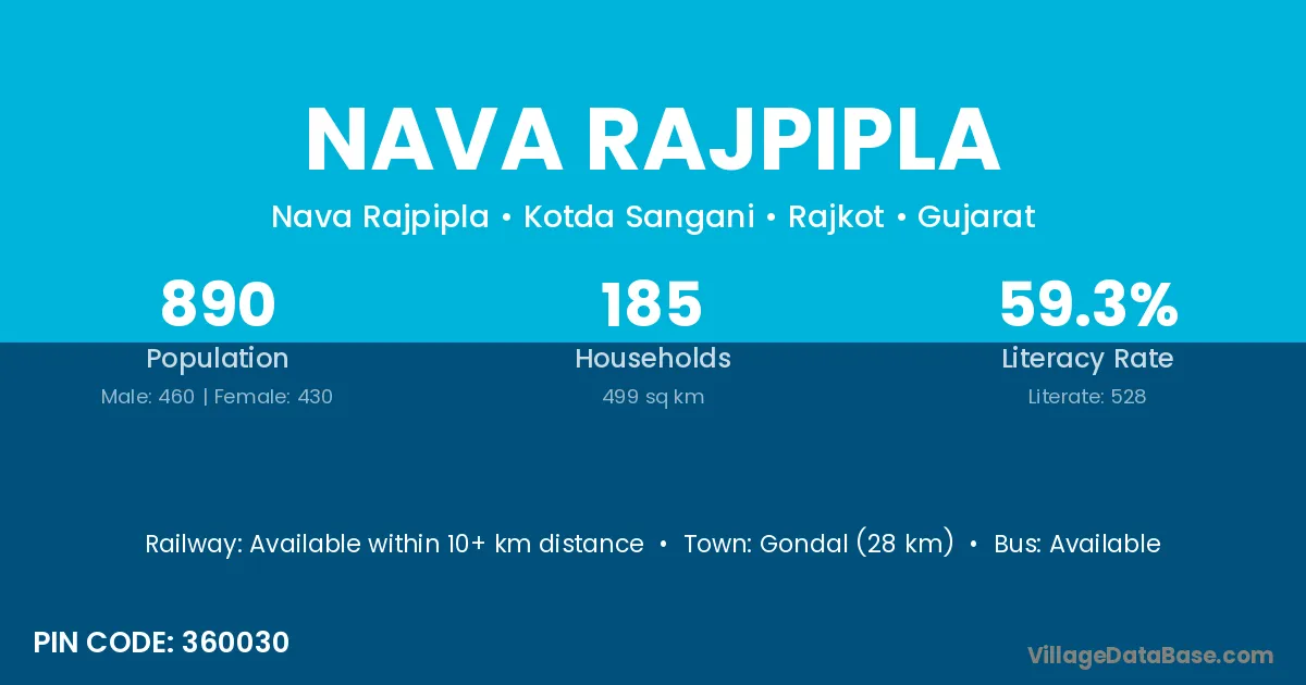 Gondal (28 km) is the nearest town to Nava Rajpipla village for major economic activities and is located approximately 28 km away.