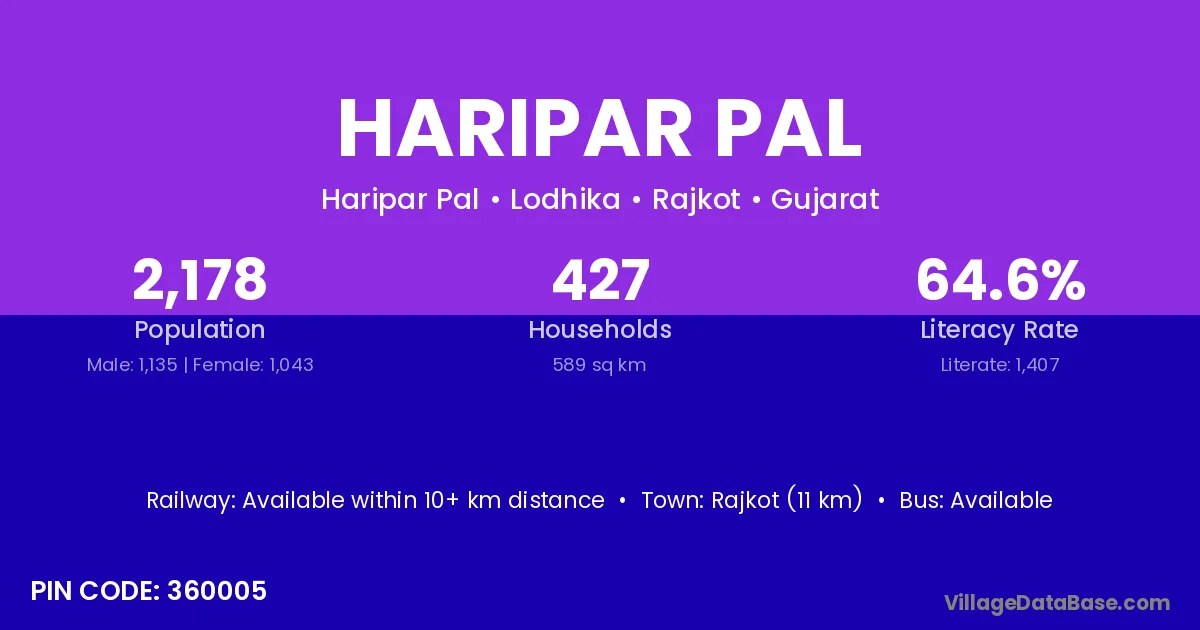 Rajkot (11 km) is the nearest town to Haripar Pal village for major economic activities and is located approximately 11 km away.