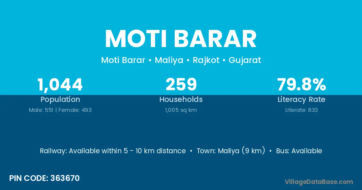Maliya (9 km) is the nearest town to Moti Barar village for major economic activities and is located approximately 9 km away.