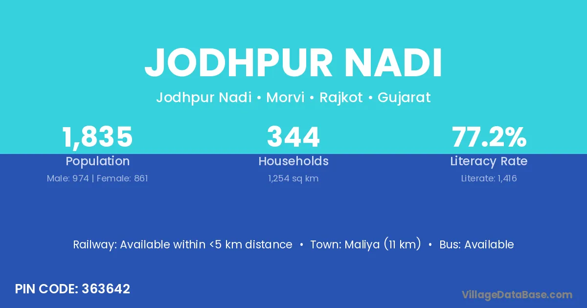 Maliya (11 km) is the nearest town to Jodhpur Nadi village for major economic activities and is located approximately 11 km away.