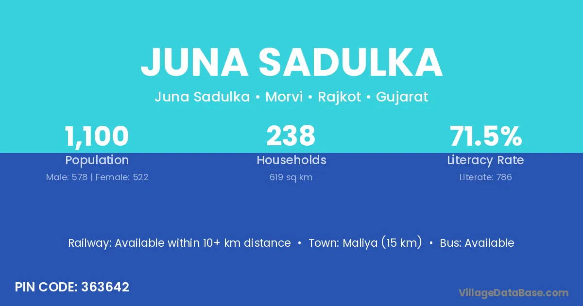 Maliya (15 km) is the nearest town to Juna Sadulka village for major economic activities and is located approximately 15 km away.