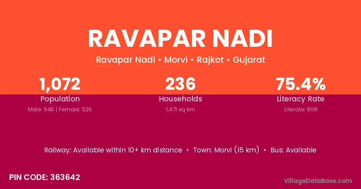 Morvi (15 km) is the nearest town to Ravapar Nadi village for major economic activities and is located approximately 15 km away.
