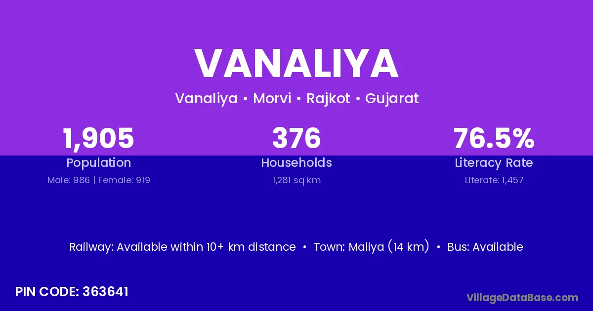 Maliya (14 km) is the nearest town to Vanaliya village for major economic activities and is located approximately 14 km away.