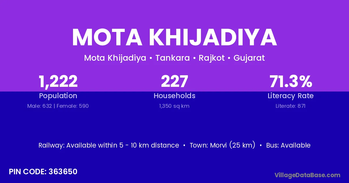 Morvi (25 km) is the nearest town to Mota Khijadiya village for major economic activities and is located approximately 25 km away.