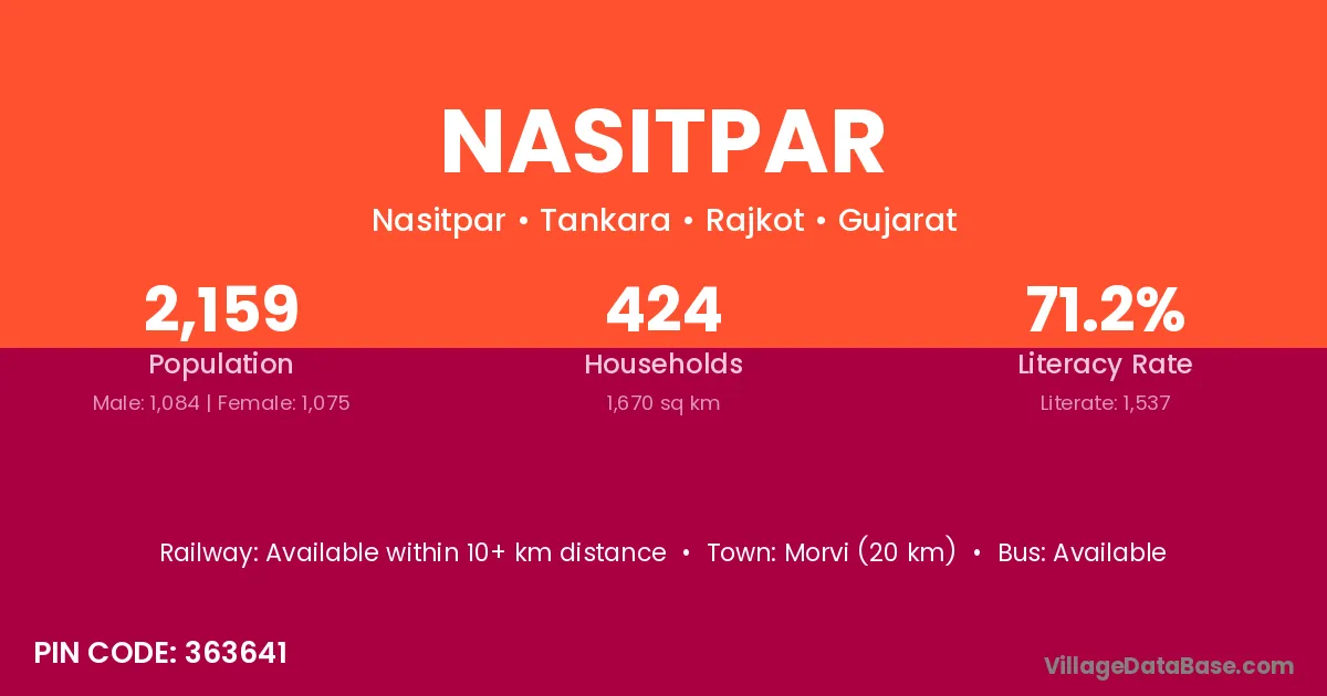 Morvi (20 km) is the nearest town to Nasitpar village for major economic activities and is located approximately 20 km away.