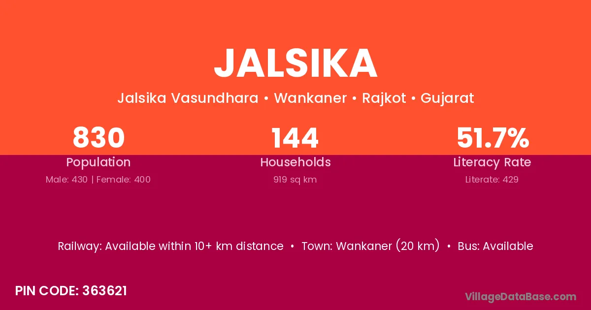 Wankaner (20 km) is the nearest town to Jalsika village for major economic activities and is located approximately 20 km away.