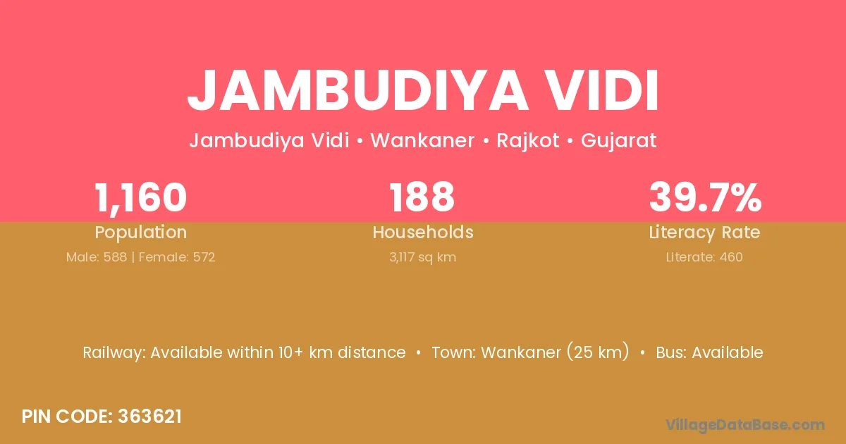 Wankaner (25 km) is the nearest town to Jambudiya Vidi village for major economic activities and is located approximately 25 km away.