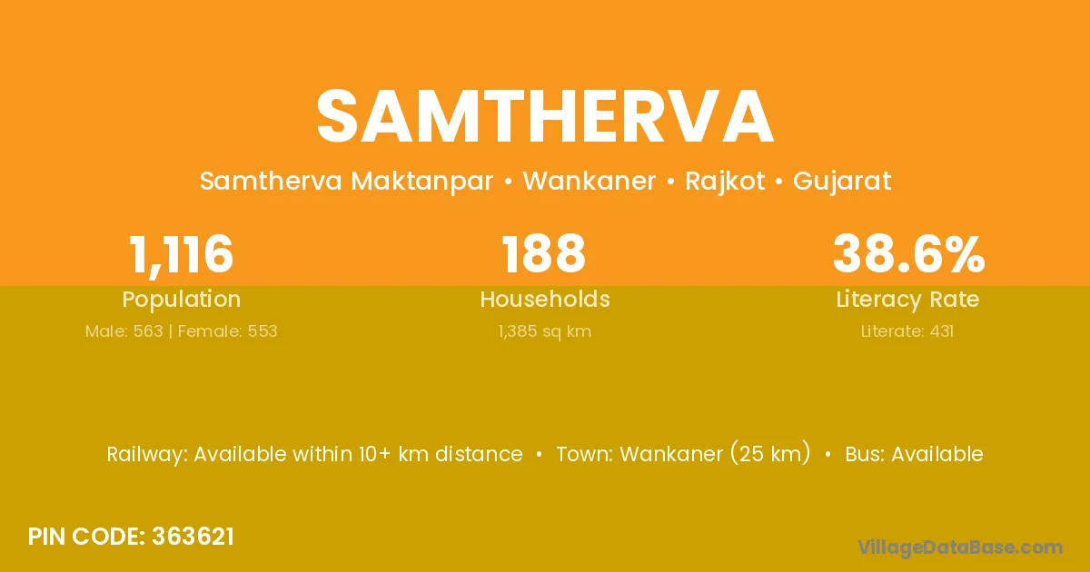 Wankaner (25 km) is the nearest town to Samtherva village for major economic activities and is located approximately 25 km away.