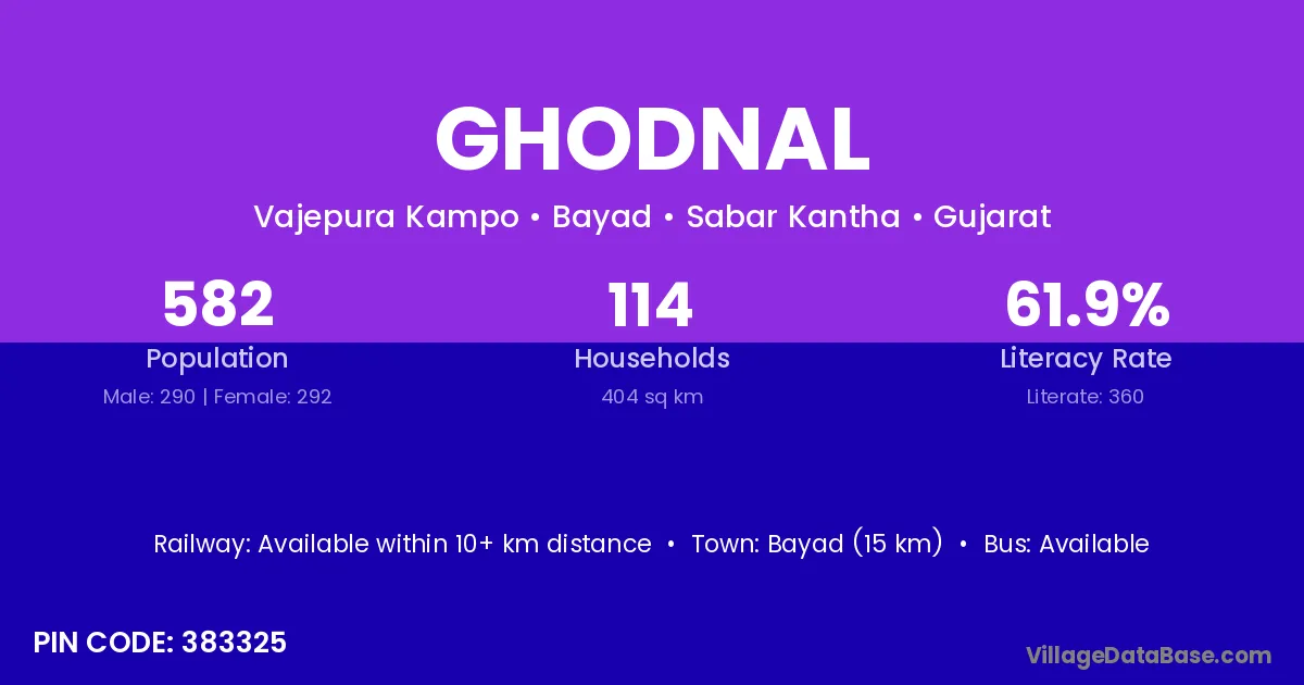Bayad (15 km) is the nearest town to Ghodnal village for major economic activities and is located approximately 15 km away.