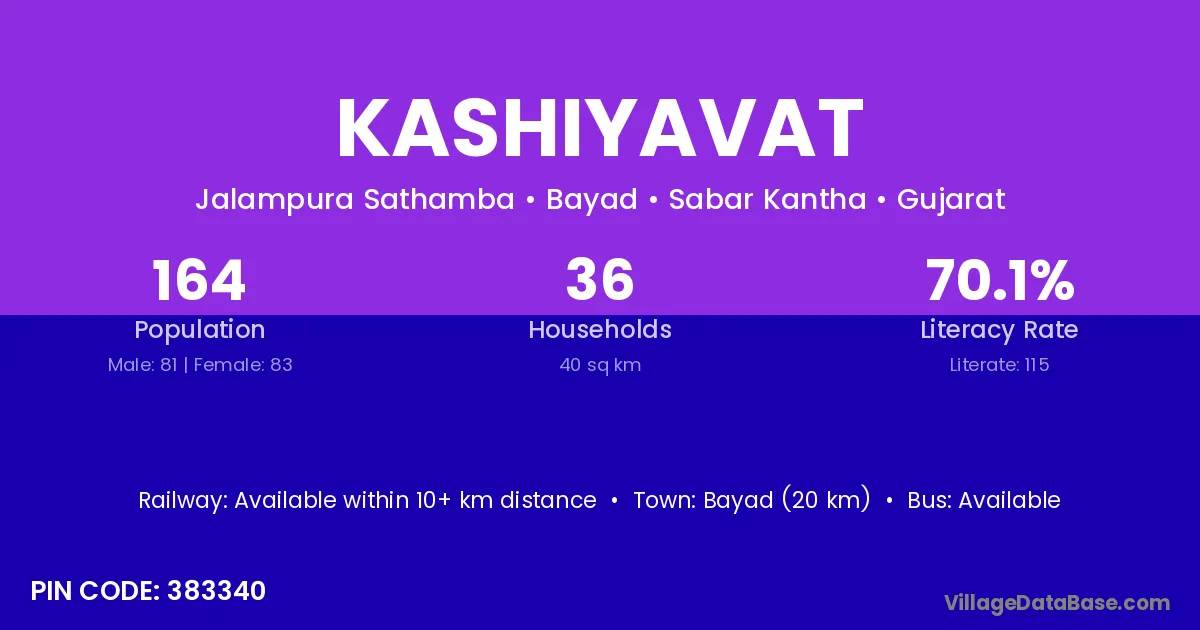 Bayad (20 km) is the nearest town to Kashiyavat village for major economic activities and is located approximately 20 km away.